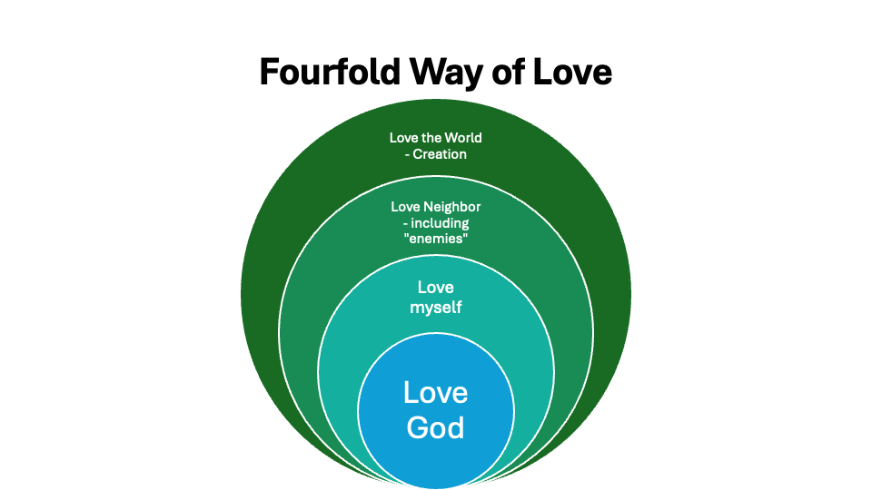 For Vision, I am still searching – this is where I feel I must let my faith be my guide – as I believe God sets the vision as “creator” and it is up to me to find my place within God’s much bigger vision for the cosmos, our world, and for me. The one thing I do know, firmly, is that the essence of God is love. And therefore my vision must start with how do I follow the quadripartite love God envisons: