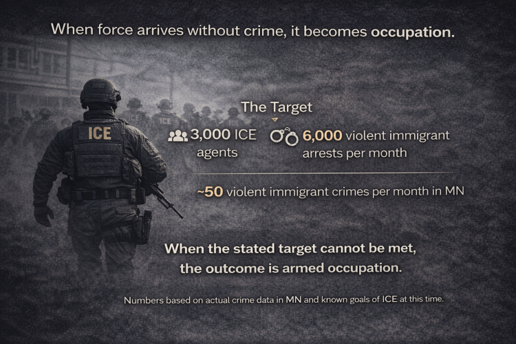 Three thousand ICE agents were deployed to hunt “violent immigrant criminals” in a state where immigrants accounted for roughly four percent of violent crime—approximately fifty cases per month already being addressed by local law enforcement. The math didn’t work. The prey was statistically nonexistent. So the target changed—from specific criminals to entire communities based on appearance alone. This was not law enforcement. ICE is not a law enforcement entity—it is a federal civil immigration agency operating outside constitutional protections that bind police. What occurred was occupation: raids without warrants, detentions without probable cause, force without accountability.